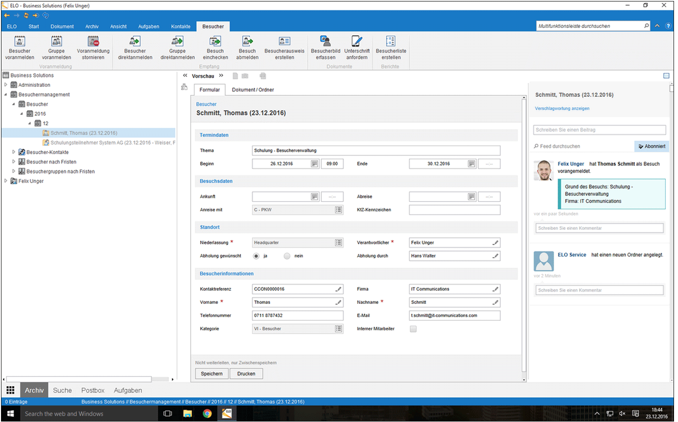 Das ELO Besuchermanagement ermöglicht die einfache Erfassung von Besucherinformationen und optimiert den gesamten Besuchsprozess – von der Planung bis zur Verabschiedung. Das spart Zeit und sorgt für eine reibungslose Organisation.